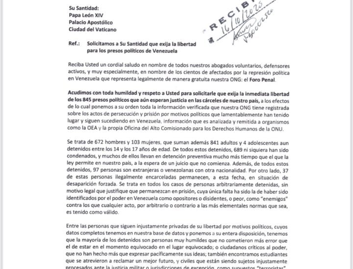 En un gesto profundamente humano y esperanzador, Foro Penal, organización venezolana reconocida internacionalmente por su defensa de los derechos humanos, envió una carta a Su Santidad el Papa León XIV, a través del Nuncio Apostólico en Venezuela, Monseñor Alberto Ortega Martín, solicitando su intervención para promover la liberación de los presos políticos en el país.